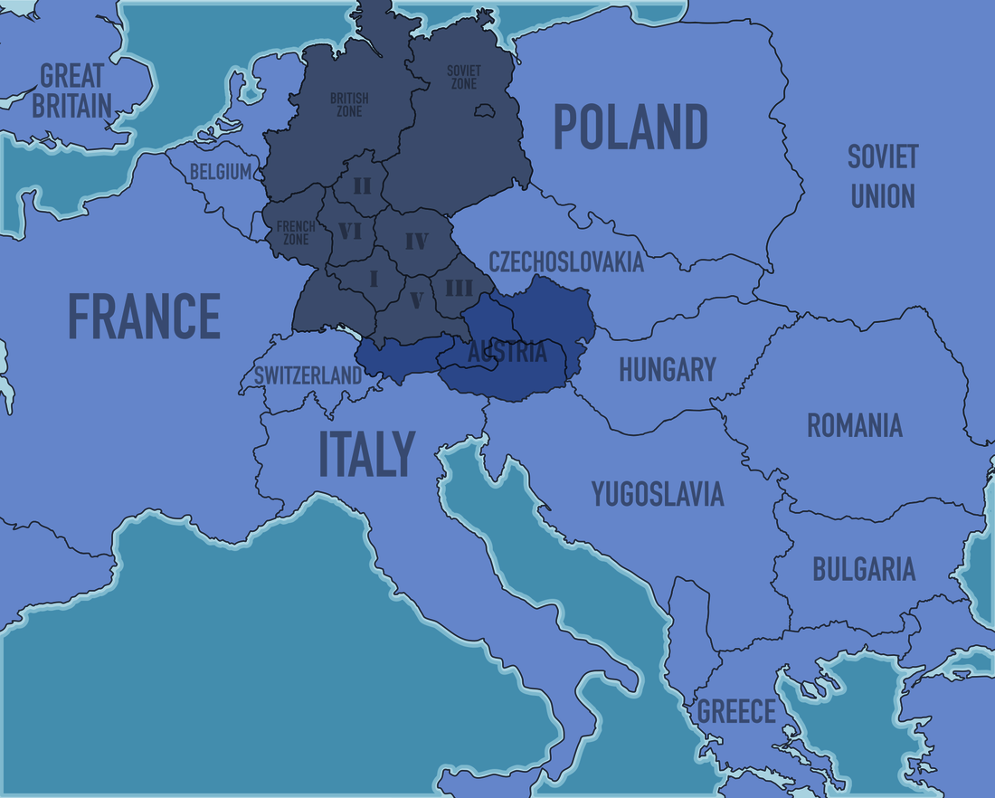 This map shows the countries that existed immediately after World War II. Germany and Austria were split into a number of administrative zones controlled by Britain, France, the United States and Russia. To see details of ORT operations and Displaced Person camps, follow the links in the menu on the right.